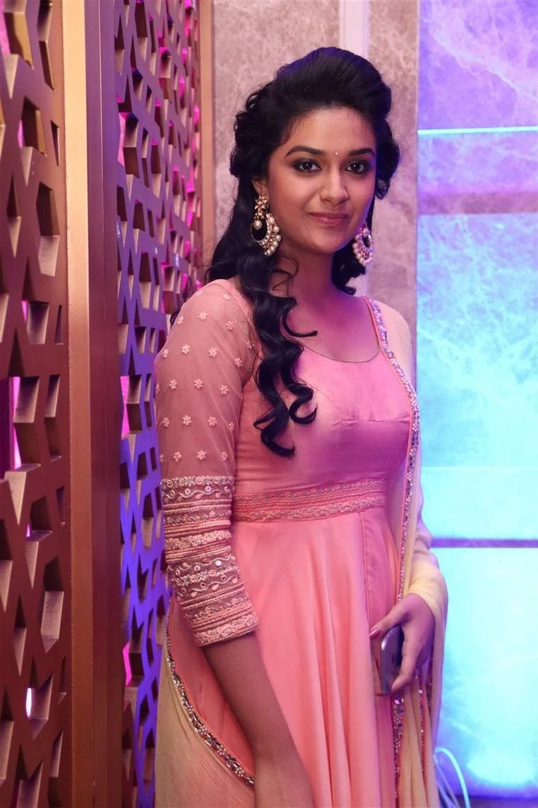 Actress Keerthi Suresh Smiling Photos In Pink Dress