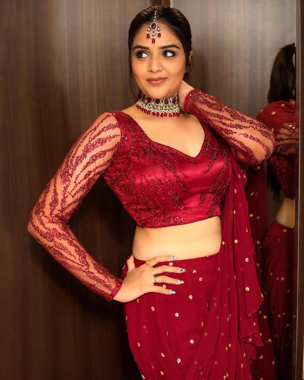 South Indian TV Anchor Sreemukhi in Maroon Lehenga Choli